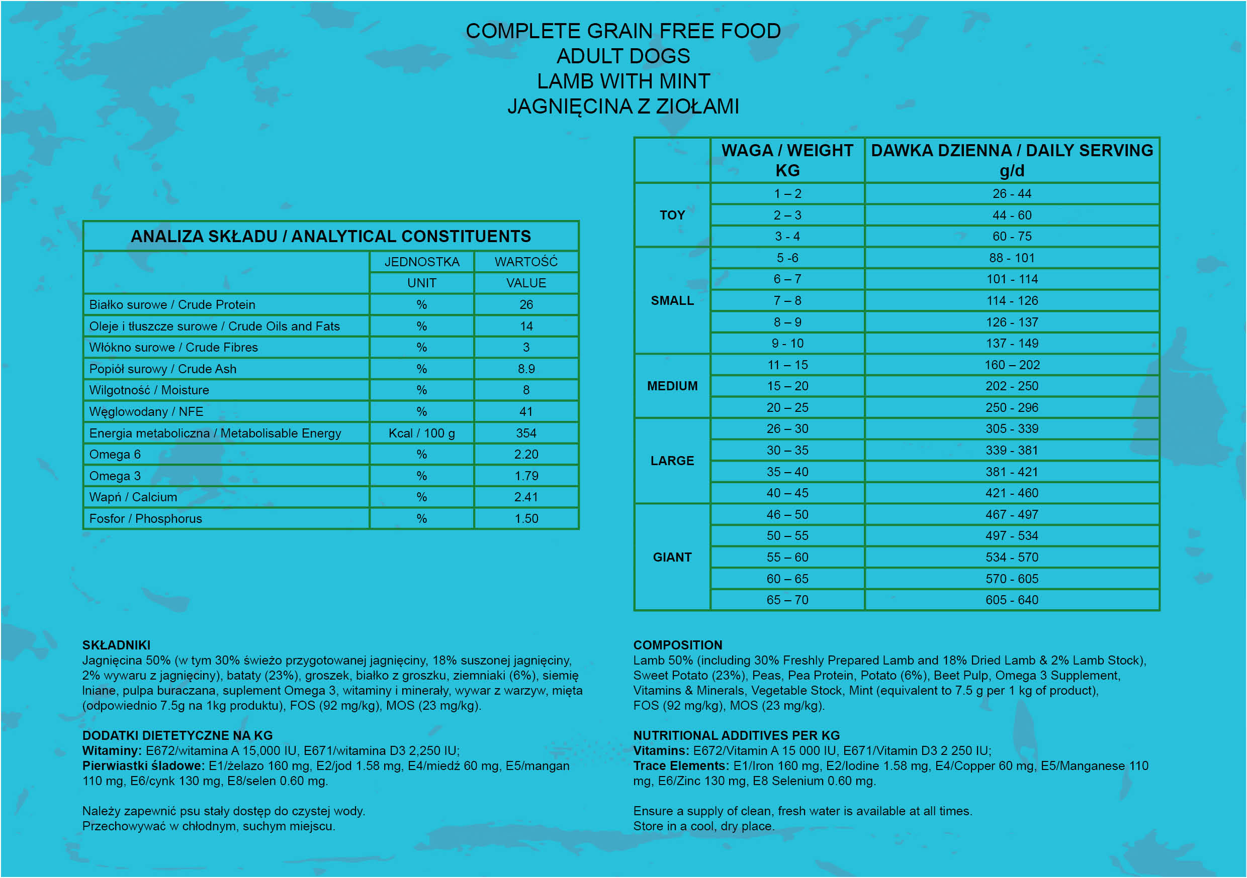 Wysokiej jakości karma bezzbożowa, wyprodukowana na bazie jednego źródła białka – jagnięciny, która pochodzi od farmerów hodujących owce na wolnym wybiegu. Mięso użyte do produkcji karmy jest bardzo wysokiej jakości i nie zawiera antybiotyków i hormonów, a jednocześnie stanowi doskonałe źródło witamin A, B1, B2, B6, C, E. Karma zawiera w sobie dodatek bioaktywnych ziół i została wyprodukowana w oparciu o hipoalergiczne składniki. Konserwowana w sposób naturalny, przy użyciu tokoferolu i rozmarynu.