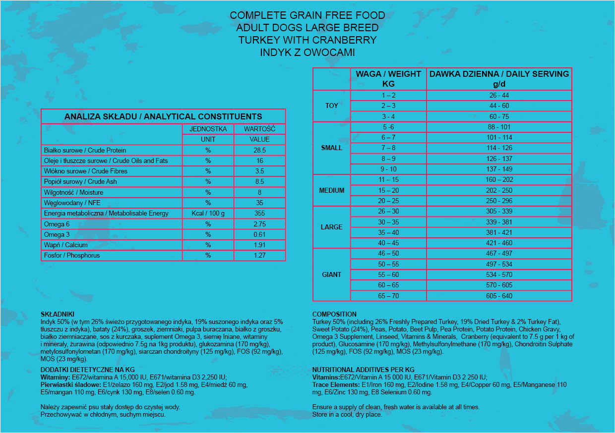 Wysokiej jakości karma bezzbożowa, przeznaczona dla psów ras dużych, wyprodukowana na bazie mięsa indyka bardzo wysokiej jakości, albowiem stanowi czyste mięso drobiowe bez pierza, łap i podrobów, a nadto jest wolne od hormonów i antybiotyków. Indyk to doskonałe źródło białek i naturalnych substancji odżywczych dla skóry i sierści, a także jedno ze źródeł kwasów tłuszczowych Omega-6. Tłuszcz zawarty w mięsie indyka jest łatwiej przyswajalny. Spośród wszystkich gatunków drobiu to właśnie indyk zawiera najwięcej cennych wielonienasyconych kwasów tłuszczowych (PUFA). Zaletą tego mięsa jest niska zawartość tłuszczu przy dużej zawartości białka. Mięso z piersi indyczej zawiera 24% białka, zaś mięso z udźca – 21%. Wartość odżywcza białek mięsa indyczego jest oceniana wyżej niż białek mięsa wołowego ze względu na mniejszą zawartość niepełnowartościowego kolagenu. Mięso indyka zawiera również witaminy z grupy B, w szczególności B12, kwas foliowy i niacynę. W mięsie indyka znajdziemy też potas, cynk, magnez i żelazo. Konserwowana w sposób naturalny, przy użyciu tokoferolu i rozmarynu.